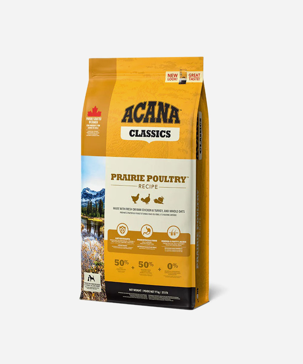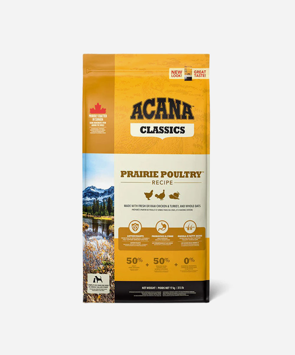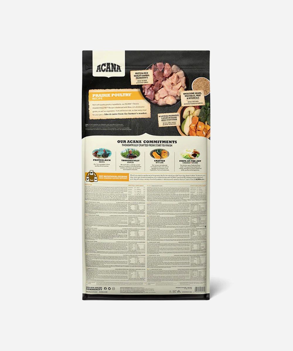 Classic Prairie Poultry Dog Food features ingredients such as Free-Run Chicken, Free-Run Turkey, whole nest-laid eggs, and sun-ripened fruits and vegetables from British Columbian farms.